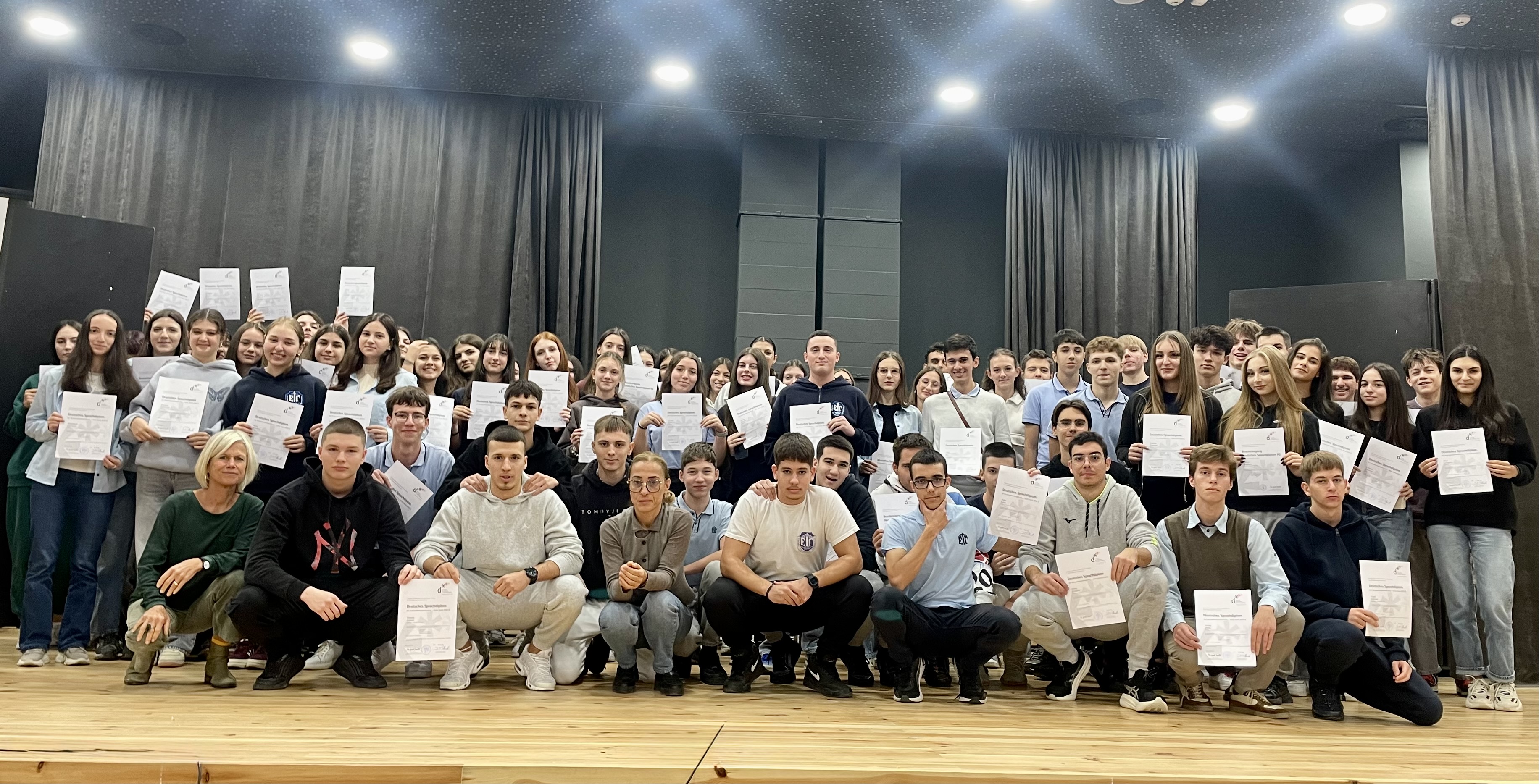 69 десетокласници получиха своите немски езикови дипломи на ниво B1. Дипломите бяха връчени тържествено от госпожа Ауф дем Берге, координатор по немски език за Североизточна България и преподавател в Първа езикова гимназия. Госпожа Ауф дем Берге поздрави учениците за добрите резултати и им пожела успешно представяне и на следващия етап от обучението за немска езикова диплома на ниво B2/C1.