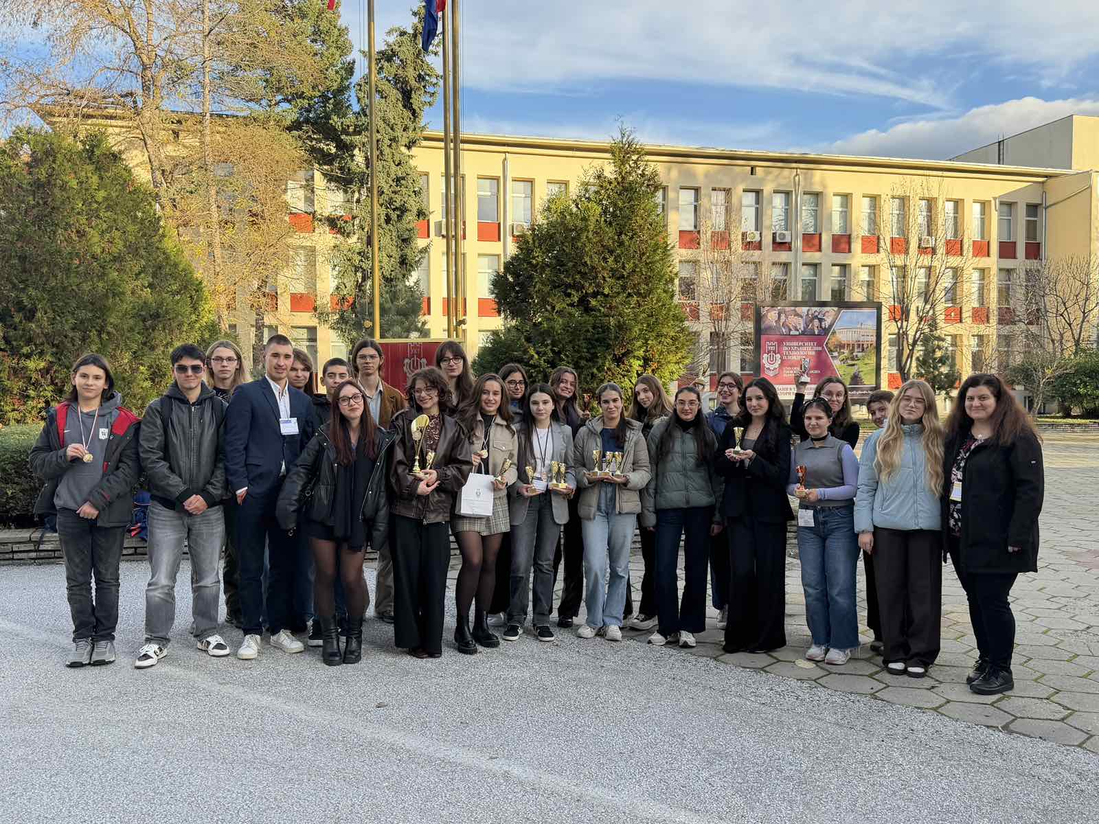 С истинска гордост споделяме, че седем ученици от нашето училище – Калина Бърнева, Вяра Маринова, Алекс Павлов, Виктория Виткова, Виктория Василева, Богдан Алексиев и Александър Желязков – се представиха блестящо на Ученическата научна конференция към Българската академия на науките, където бяха оценени от петчленно академично жури измежду 189 проекта. Те разработиха и защитиха 6 научни проекта, като всички преминаха успешно първото класиране и бяха допуснати до жива защита пред академична комисия. Резюметата на техните изследвания бяха отпечатани в официалната сборна книга на БАН – признание за високото качество и значимост на работата им. Във финалното класиране Калина Бърнева заслужено зае трето място, доказвайки отлична научна подготовка и впечатляваща презентационна култура.