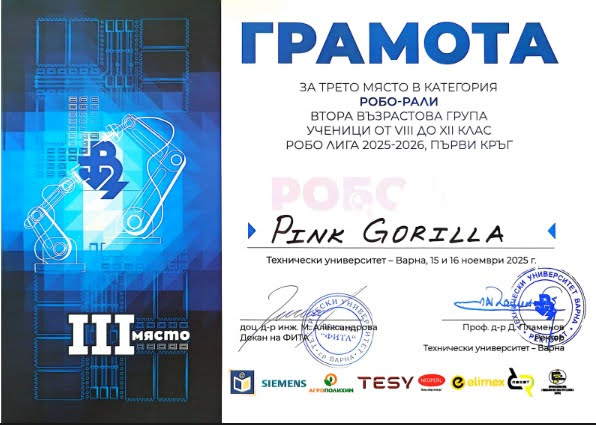На 15 и 16 ноември се проведе първият кръг на състезанието „Робо Лига“ в ТУ – Варна. Първа езикова гимназията се включи с четири отбора. Отбор Pink Gorila - Галена Галинова и Томислав Иванов от 9.д, се класираха на II място в категория DRAG и III място в категория РОБО-РАЛИ. Отбор Golf - Константин Пенев от 12.д, зае III място в категория СЛЕДЕНЕ НА ЛИНИЯ (САМОДЕЛНИ РОБОТИ).