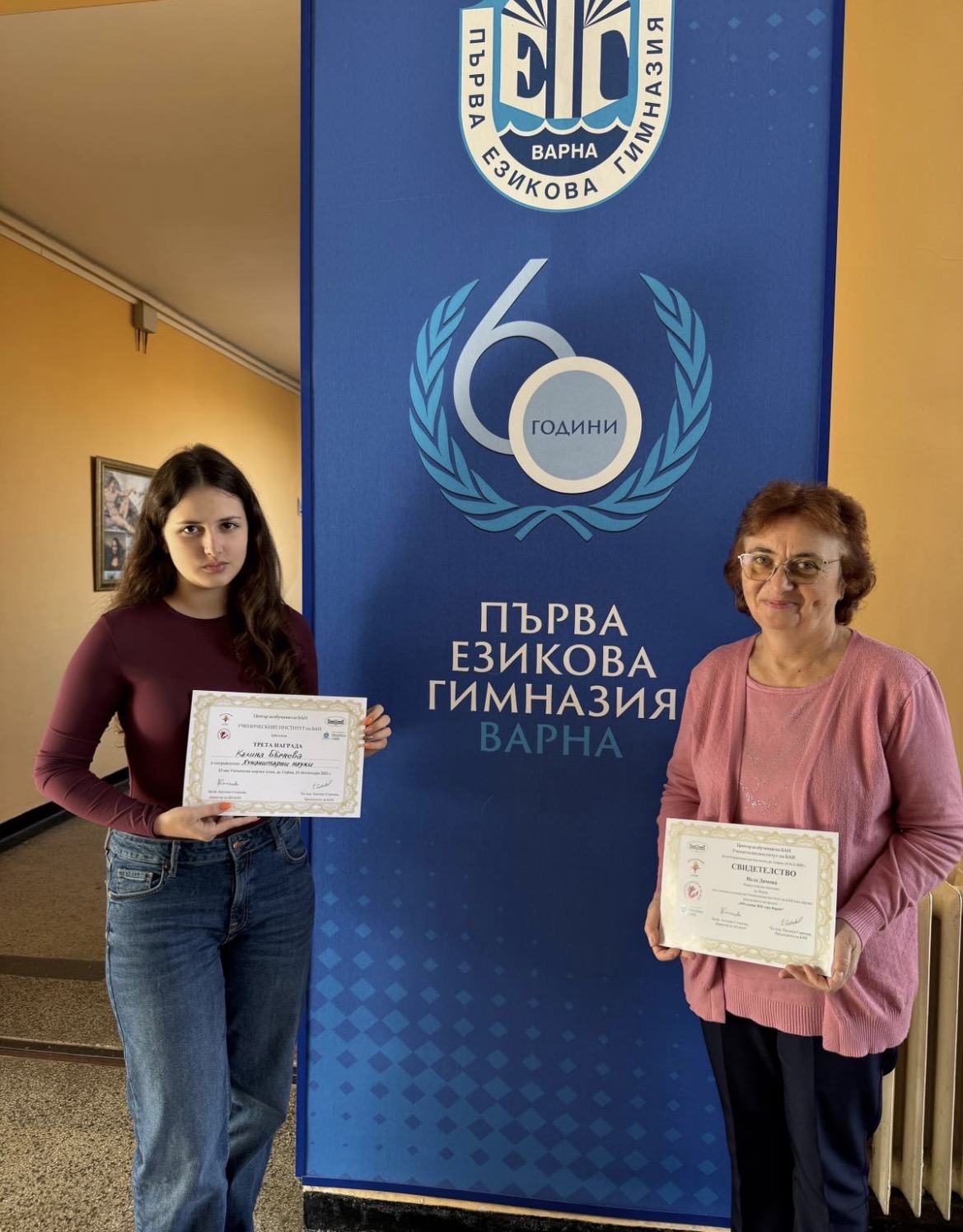 На провелия се на 24.10.2025 година в СУХНИ „Константин Преславски“ областен кръг по речеви и комуникативни умения на английски език първо място спечели Изабела Колева, ученичка от 11.в клас в Първа езикова гимназия. Участничката в клуба по дебати на английски език единствена ще представи област Варна на националния кръг. Желаем ѝ успех!