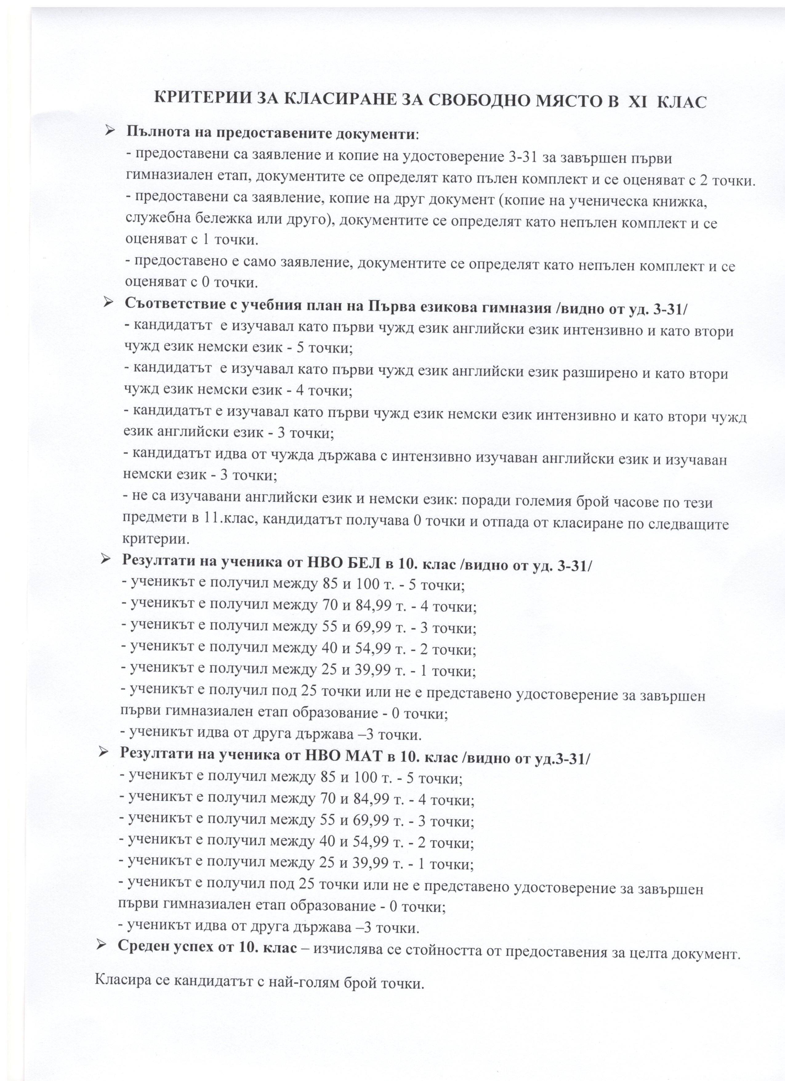 Критерии за класиране за свободното място в 11.клас